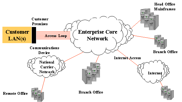 _________________ __________ A typical communications system includes enterprises branch offices connected by its core network to communicate with the head office and with each other. The branch offices, to connect to its core network, use the Internet and/or the PSTN. Access Loop - An access facility to connect the CPE to the high speed communications network. It could be connecting a PABX, A LAN and a computer to the backbone network. Core Network - A high speed network using ATM infrastructure or router infrastructure to connect the major locations of an enterprise.