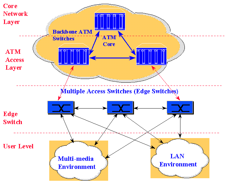 Module 4 - ATM Technology Slide 26 of 46 _________________ __________ ATM Network Architecture _________________ __________ ATM network architecture consists of User Layer, ATM Edge Switches, ATM Access Switches and Core ATM Switches. User Layer - Represents the desktop and its close vicinity, which may extend to a workgroup, building or campus. Edge Layer - An Edge Layer switch Represents the gateway between local and wide area. This switch could be located at the customer's premises. The primary function of this switch is access consolidation. Access Layer - This layer includes the ATM switches at the periphery of Core ATM Backbone Layer. These switches are used to connect edge switches and to provide direct ATM access interface to customers requiring OC-3 connections. Core Layer - This layer is composed of very large ATM switches provisioned as cross-connects. These switches do not have access interface and are used to provide high speed trunk connections.