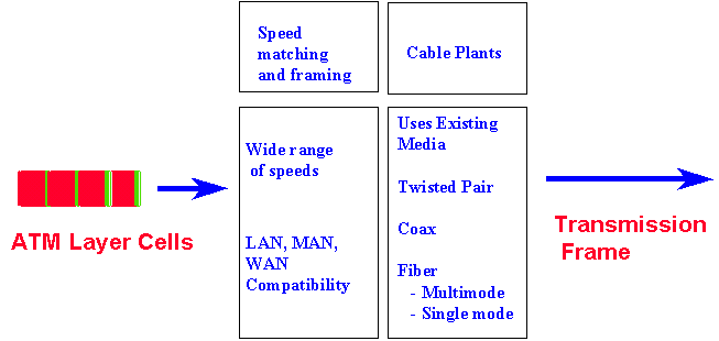 Module 4 - ATM Technology Slide 29 of 46 _________________ __________ ATM Switch Physical Layer Operation _________________ __________ An ATM Physical Layer is equivalent to Layer 1 of the OSI model. It provides speed matching and framing, and interfacing to the plant, which is normally optical fiber using SONET. This layer provides speed matching and framing on both access and trunk side.
