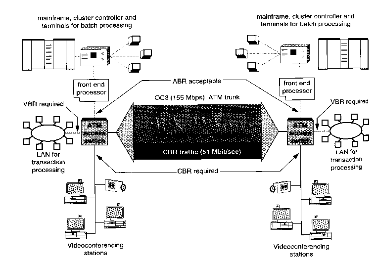 Module 4 - ATM Technology Slide 41 of 46 _________________ __________ Case Study #1 - An ATM Network Implementation _________________ __________ This diagram shows two locations of an enterprise using ATM switches. The two switches are connected using a SONET link running at OC-3 (155 M bps). Customer Application#1 - Videoconferencing, using Constant Bit Rate (CBR) ATM service at 51 M bps. Customer Application #2 - Mainframes, Cluster Controllers and Terminals for batch processing using Available Bit Rate (ABR) ATM service at 1.5 M bps. Customer Application #3 - LAN for Transaction Processing using Variable Bit Rate (VBR) ATM service at 100 M bps.