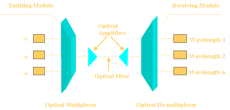 Module 5 - SONET, WDM, DWDM and B-ISDN Technologies Slide 13 of 76 _________________ __________ An Optical Fiber Transmission system _________________ __________ A fiber optical communications system consists of a Light Source, Wavelengths Multiplexer and Demultiplexer, Optical Amplifiers, Optical Add and Drop Multiplexers and a Light Detector. Light Source - Converts signals from computer or terminals into the light to be placed on the optical fiber. Wavelengths Multiplexers and De-multiplexers - Used to carry multiple waves on a fiber. Optical Amplifiers - Used to regenerate the signals. Optical Add and Drop Multiplexers - Used to extract the wavelengths and insert wavelengths. Light Detector - At the receiving end detecting and converting the light signals into an acceptable terminal format.