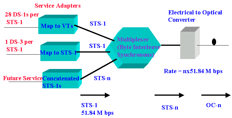 Module 5 - SONET, WDM, DWDM and B-ISDN Technologies Slide 43 of 76 _________________ __________ SONET Multiplexing _________________ __________ Any type of service (voice, high speed data and video) is accepted by the Service Adapter. A Service Adapter maps the signal to the payload envelope of the STS-1 or VT. All signals are eventually converted to STS-1 or higher. Future services include video, FDDI, Broadband ISDN, ATM and MPEG-2.