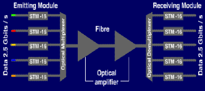 Module 5 - SONET, WDM, DWDM and B-ISDN Technologies Slide 66 of 76 _________________ __________ A WDM System _________________ __________ This WDM system carries 4 STM-16 (2.5 G bps) over a fiber.