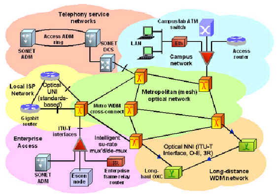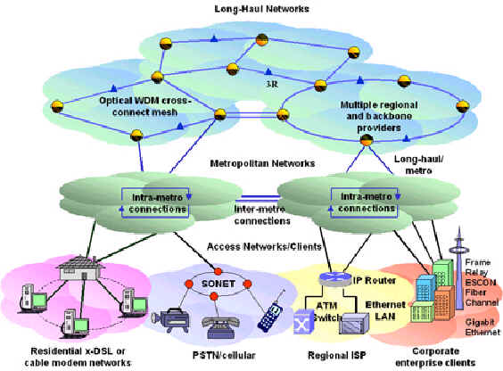Module 5 - SONET, WDM, DWDM and B-ISDN Technologies Slide 72 of 76 _________________ __________ Future of Optical Networks _________________ __________ The future Optical Networks in the high-level hierarchy will have long-haul, metro and access network components. The long-haul networks, will be responsibility of large trans-national and global carriers, which will span both regionally and extend geographically over thousands of kilometers. These networks will connect Metropolitan area networks and amongst each other will extend global connectivity between regions. The long-haul networks and Metropolitan Area Networks will deploy DWDM and SONET/SDH technologies. The access networks will represent the edge of the MAN. The access networks rates will range from DS-1, DS-3, OC-3, OC-12, Ethernet to OC-48 to OC-192. The access network customers will be made up of residential customers, and large corporations including private, government and educational institutions.