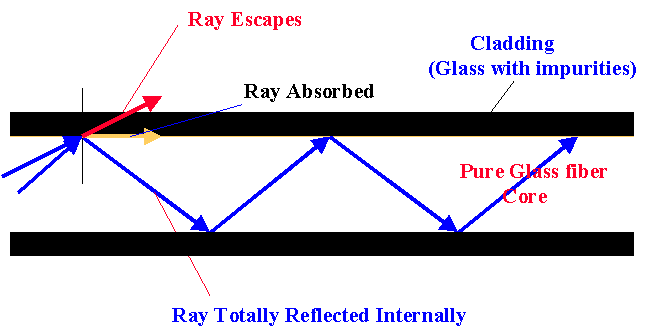 Module 5 - SONET, WDM, DWDM and B-ISDN Technologies Slide 7 of 76 _________________ __________ Principle of Fiber Transmission _________________ __________ The fiber cladding has a lower refractive index than the fiber core. The entering light wave is reflected back to the center of the core. The cladding is formed by infusing impurities into the fiber.