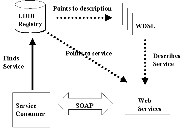 _________________ __________ A service provider describes the service using WSDL and registers the service in aUDDI registry. The UDDI registry maintains pointers to the WSDL description and to the service. When a service consumer wants to use a service, he asks the UDDI registry to find a service that matches his needs and obtains the WSDL description of the service, as well as the access point of the service. The service consumer uses the WSDL description to construct a SOAP message to communicate with the Web Service. Some times a Service Broker is used to find the required service.