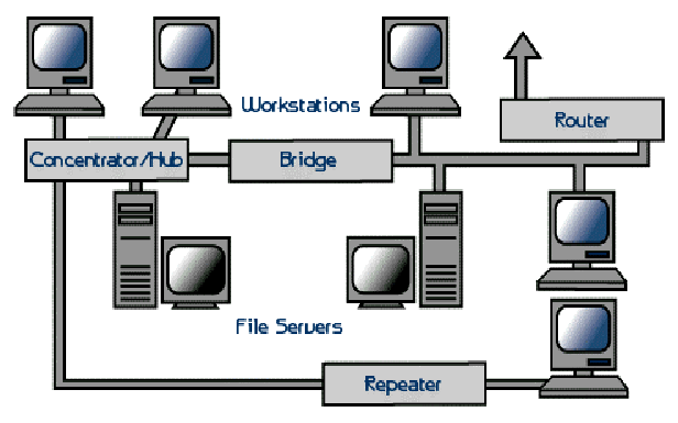 LAN Devices _________________ __________ A typical LAN includes routers, repeaters, concentrators/hubs, bridges and work stations. Router - A router routes traffic between LANs and other network links. It translates information from one network to another. A router selects the best path to route a message based on the destination and address of origin. A router is a smart device and has addresses of computers, bridges and other routers on the network. A router can listen to the entire network to determine the best route for routing the information. Repeater - A repeater is a LAN extender. It amplifies the signal it receives and rebroadcasts it. A repeater can be a stand alone device or incorporated into a concentrator. A repeater is normally used when the total length of network cable exceeds the allowable standard length. Bridge - A bridge is also a LAN extender. It connects two segments of the network. A bridge connects an old wiring segment with the new up-to-date segment. A bridge monitors the information traffic on both sides of the network and passes the packets of information to the correct location. A bridge can be used to connect different types of cabling, or physical topologies. Concentrator / Hub - It is a central connection point for cables from workstations, servers and peripherals. It provides scalability to the network. Most concentrators are active devices amplifying signals as it moves from one device to another. Concentrators are often used in a star or star-wired ring topology. Network Interface Card (NIC) - A NIC provides the physical connection between the network and the computer workstation. Most NICs are external. Ethernet NICs contain interface connections for coaxial cable or twisted pair cable. Token Ring NICs are similar to Ethernet NICs. Server - It is a most important element of the network. It is a fast computer with a large amount of RAM and storage space with a fast interface card. A file server contains network operating system software, application software and data files to be shared. A server controls the communication of information between nodes on the network. Workstation - All computers are connected to a server in the network. A workstation requires a NIC to connect to a LAN.