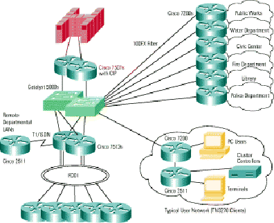 100 M bps Ethernet LAN Configuration Customer: City of Houston, Houston, U.S.A. Customer Profile: The City of Houston employs 23,000 people in 18 departments. Each department has their own IT departments with systems from IBM, Hewlett-Packard, Honeywell, Unisys and Amdahl. The city had a X.25-based network from AT&T operating at 9600 bps. In 1995, the city asked router vendors to design a network that could support its voice and data requirements for the 21st century. The city wanted to construct a TCP / IP based WAN to replace the X.25 network and integrate it with two existing fiber-optic networks. Solution: Cisco designed a TCP/ IP based WAN to meet the City of Houston's needs by using 100 M bps Ethernet LAN routers. Network Architecture: The city network uses Cisco 7200 and