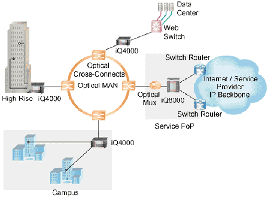 Optical MAN Solution Provider: The Quarry Technologies The Business Challenge: An Optical MAN service provider to deliver IP services to corporate and small business customers residing in multi-tenant units and industrial parks. The Optical MAN service providers are threatened by the competition and fear that their current high-speed Internet access will become a commodity unless they offer value added services. The Opportunity: Optical MAN service providers to offer full complement of IP services to their clients. The Quarry Technologies Solution: The Optical MAN service providers are to deploy the Quarry Technologies IP Services Edge Switch, iQ4000, at each of its POPs and large aggregation sites. This solution will help the service providers to offer advanced IP services, like application level QOS, Virtual Private Networks, advanced security services without impacting existing infrastructure.