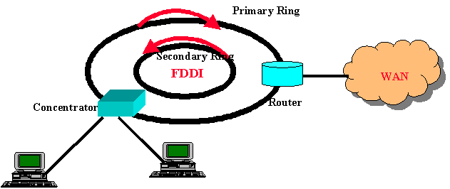 _________________ __________ The Fiber Distributed Data Interface (FDDI) specifies a 100 M bps token-passing, dual ring MAN using fiber optic cable. FDDI protocol can also run over copper cable and is known as Copper-Distributed Data Interface. FDDI Standard: - The American National Standards Institute developed a specification for the FDDI written by the ANSI Committee X3T9.5 in the mid 1980s. FDDI Rings: - FDDI uses dual-ring architecture with traffic on each ring flowing in opposite directions. It consists of a primary and a secondary ring. In normal operations the primary ring is used for data transmission, and the secondary ring remains idle. A concentrator allows a facility to connect stations and provide for reconfiguration. It allows the secondary ring to take over the transmission during the failure of the primary ring. FDDI Specifications: The optical fiber channel operates at 100 M bps with a 1300 nm signal. It uses the baseband transmission method. Up to 1000 nodes can be connected to one optical ring. The maximum distance between adjacent nodes can be 2 km apart and the fiber ring circumference can be 120 kms.