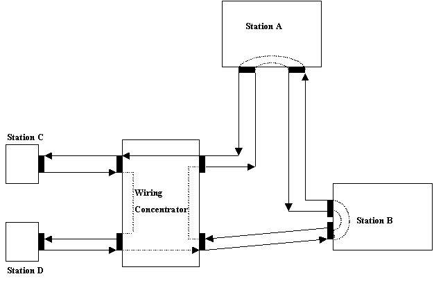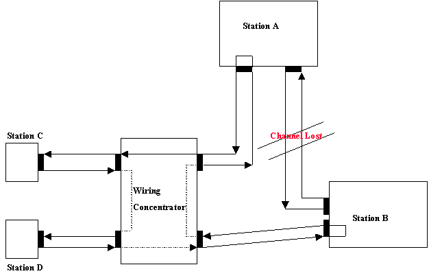 _________________ __________ The wiring concentrator allows reconfiguration. Stations A and B are connected to the Inner Ring while stations A, C and D are connected to the Outer Ring. The Inner Ring in this architecture is the primary ring and the Outer ring is the secondary ring. When a channel is lost between stations A and B, the network is re-configured to maintain its survivability. FDDI Token Protocol - The principle is the same as the Token Ring LAN. FDDI permits multiple users to occupy the ring at one time. When a station captures the token it transmits its frame on to the ring. The station also transmits a new token behind the frame. The token circulates on the ring and is copied by the stations that are identified in the frame address field. If another station wishes to use the ring it captures the token, and places its data behind previous stations' frame. The later station issues a new token behind its frame. The frame circulates on the ring. The originating stations absorb their frames as they circulate back around the ring. The station checks the source address to determine if it should absorb the frame.