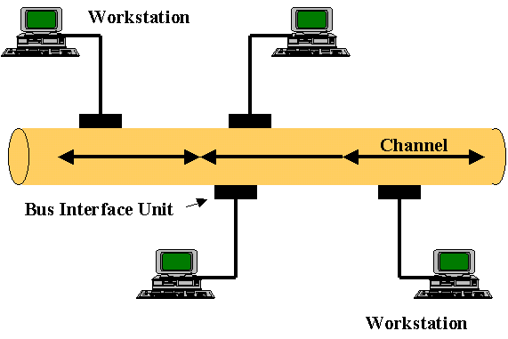 _________________ __________ Most common topologies are Bus and Ring. Bus topology is used in Ethernet LANs. Ring topology is used in Token Ring LANs. Bus Topology: Stations are attached to a channel (such as coaxial cable or optical fiber) by a bus unit. Bus Interface Units are responsible to listen to the signals on the bus