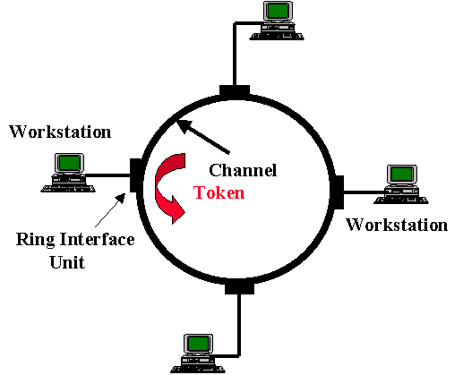 Ring Topology: The stations are connected to a concentric ring through a Ring Interface Unit. Each Ring Interface Unit is responsible to monitor the data passing through it as well as to regenerate the signal and pass it to the next station.