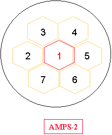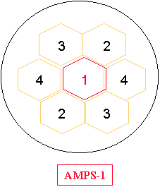 (Reverse direction) AMPS-1 used 4 hexagonal shape cells to cover a metropolitan area. Adjacent cells never use the same frequency. Each cell can use 1/4 of the available frequency channel pairs. A base station in a cell uses one frequency to communicate reliably with any mobile within its coverage area. The radius of the cell is typically 0.5 Km for urban areas to 20 Km for rural areas. AMPS-2 used 7 hexagonal shaped cells to cover a metropolitan