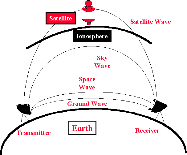 ________________ Radio waves, like fiber, coax-cable and twisted copper-wire pair, are another means of transmitting information. This type of communication is known as wireless communications. Wireless communications systems are used to send messages between two locations using radio waves which travel across free space. Messages of all types, voice, music, image, video and text, are usually converted to digital form and are represented as a stream of 1's and 0's. Voice messages can be represented by 16,000 bps, CD quality music needs about 100,000 bps, and TV quality video messages require 1,000,000 bps. Radio waves are electromagnetic waves used to carry a message over a distance. A radio wave is also known as a carrier wave. It looks like a sine wave and moves at a very high speed, cycles per second The electromagnetic waves of different frequencies and wavelengths have different properties. Radio waves can travel through walls, but light waves can't. Lower frequency waves travel further, and can bend around corners. Higher frequency waves travel in line of sight. The radio frequency spectrum covers extremely low, below 300 HZ, to Tremendously High Frequencies (THF), 300 G Hz - 3 T Hz band. Terrestrial radio-link systems carry a substantial part of all telephone, data and television traffic. There are four type of radio waves: Ground, Space, Sky and Satellite. Ground Wave - propagates along earth's surface - usually low frequency bands (30 K Hz - 300 K Hz). The medium frequency band (300 K Hz - 3 M Hz) is used for radio broadcasting. Space Wave - travels in a straight line between a transmitting and a receiving antenna. This wave is used to broadcast TV signals in VHF (30 M Hz - 300 M Hz), UHF (300 M Hz - # G Hz) and SHF (3G Hz - 30 G Hz) bands. Sky Wave - is transmitted upwards into the ionosphere and a portion of it is reflected to the ground. It uses 3M Hz - 30 M Hz frequency band. It is extensively used by radio broadcasting and long distance telephone systems. Satellite Waves - are transmitted to a satellite