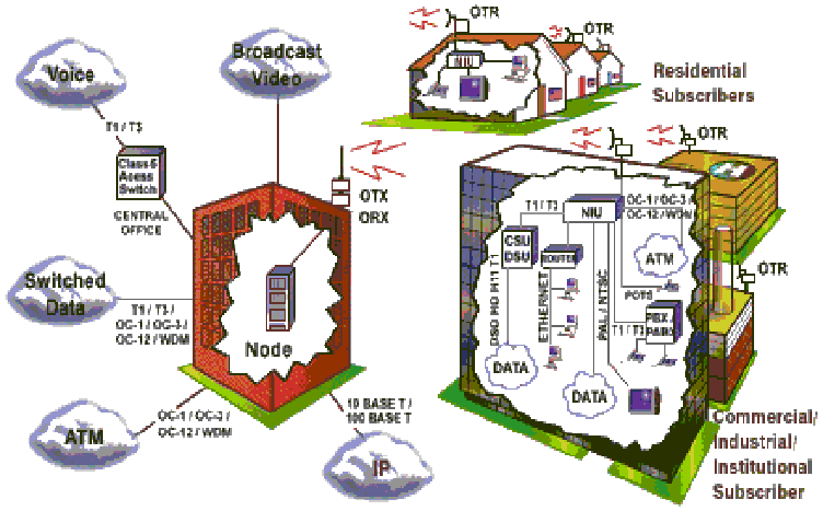 ________________ LMDS is a broadband wireless system using ultra high frequency microwaves to send and receive two-way broadband signals. LMDS provides a wireless infrastructure, using line-of-site radio links. LMDS comprises systems that are licensed to operate in the 24, 28, 31, 38 and 42 G Hz bands. LMDS provides an effective last-mile solution for the incumbent service provider and can be used by competitive service providers to deliver services directly to end users. The acronym LMDS can be explained by L for Local, M for Multipoint, D for Distribution and S for System or Service. Local indicates that propagation characteristics of signals in this frequency range limit the potential coverage area of a single cell site. The range of an LMDS transmitter in a metropolitan area is 5 miles. Multipoint indicates that signals are transmitted in a point-to-multipoint or broadcast method and the wireless return path from the subscriber to the base station is a point-to-point transmission. Distribution refers to the distribution of signals, which may consist of multi-media (voice, data, Internet, and video) traffic System indicates the subscriber nature of the relationship between the operator and the customer; the services offered through an LMDS network are entirely dependent on the operator's choice of business Why LMDS? Multi-media Applications: