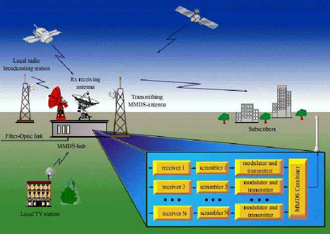 ________________ The MMDS Hub could be connected to other hubs or networks via fiber-optical links. It receives the programs and adds local community content for local broadcasting. MMDS systems are intended for a local community. MMDS systems affordability for the broadcast range of social strata of population having different incomes is considered a very important advantage. MMDS can be applied both as simple and inexpensive solutions for receiving TV programs by the entire urban population and as a value-added TV system providing channel packages for customers who want value for their money. MMDS can also be used for accessing data transmission networks, Internet and telephone services. A typical system includes: |