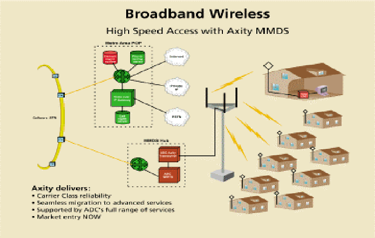 Module 9 - Wireless Systems and Technologies Slide 56 of 80 ________________ A Case Study - MMDS Network MMDS Network - Axity Broadband Wireless Access System MMDS Service Provider: ADC Telecommunications (http://www.adc.com) Network Architecture: ADC Telecommunications offers service providers carrier - class architecture to provide 2-way delivery of services. Axity Broadband wireless access system operates at 2.5 G Hz MMDS spectrum. A Metropolitan Area POP provides access to the International, Internet IP and the PSTN. ________________