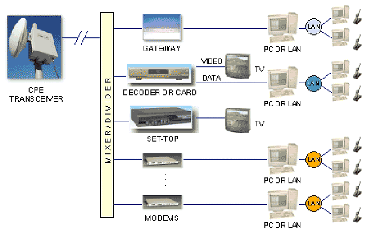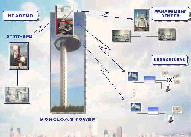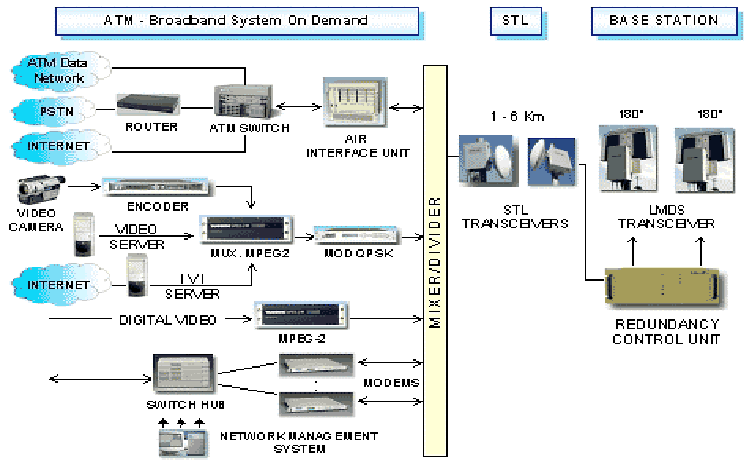 Communications Service Provider The service provider has decided to locate a Headend at Madrid’s Polytechnic University Campus. The Headend will house the Network Access Infrastructure (ATM data network, PSTN, Internet connections and video information feeds) and the Network Management Center. The service provider is planning in phases for LAN-to-LAN connection at 0.5 M bps, Internet access at 1 M bps, Video conferencing at 0.5 M bps and TV broadcasting at 2 M bps (compressed) to residential customers. In phase 1, the service provider will service 200 SOHO customers at a distance of 5 km from the base station providing 99.99% service availability. The services available to SOHO customers are Telephony, Internet access, Video conferencing and TV broadcasting. The final LMDS network will provide more services and higher service availability to a wider area. In Phase I the service provider will deploy one cell to cover all the potential customers. As demand grows more cells will be added. Network Architecture: