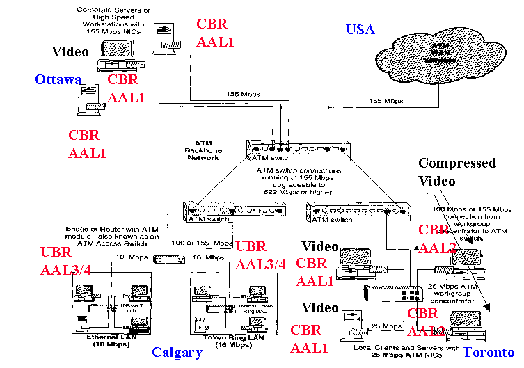 workshop is about a fictitious company, Westco Electronics Enterprise is a Canadian company with its head office in Ottawa, Ontario. It develops products in Ottawa, Toronto and Calgary locations. The company markets its products to a large distribution company in SanFrancisco, California from the Ottawa office. Enterprise Communications Needs: Westco in Ottawa has two corporate servers (requiring 155 M bps connections), and one workstation (requiring 25 M bps connection), in Calgary one Ethernet LAN (10 M bps) and one Token Ring (16 M bps) and in Toronto three ATM workgroup stations (25 M bps) and a server (25 M bps). The head office is connected to the distributor's ATM network at 155 M bps. All locations deal with each other to work on the design, development, manufacturing and marketing of the company products. It uses the public telephone network for voice communications. Workshop Tasks: Task 1: Draw Westco network architecture Task 2: Identify ATM services and ATM adaptation layers required for each location
